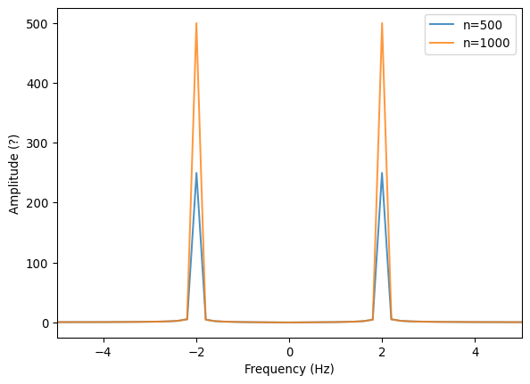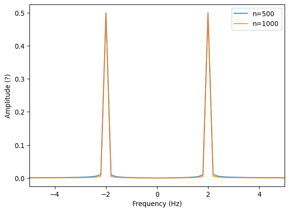 import matplotlib.pyplot as pltimport numpy as npdef get_sine_and_time(duration, freq, samples, amplitude=1):"""Return an array of time, sine with specified parameters""" time = np.linspace(0, duration, num=samples) sin = amplitude * np.sin(2* np.pi * freq * time)return time, sindef get_fft_and_freqs(time, signal):"""return the fft and corresponding frequencies of a signal""" fft = np.fft.fft(signal) dt = time[1] - time[0] # assuming evenly sampled freqs = np.fft.fftfreq(len(time), dt)return np.fft.fftshift(freqs), np.fft.fftshift(fft)def plot_amplitude_spectra(freqs1, fft1, freqs2, fft2, lims=(-5, 5)):"""plot amplitude spectra without normalization""" plt.plot(freqs1, np.abs(fft1), label=f"n={len(freqs1)}", alpha=0.8) plt.plot(freqs2, np.abs(fft2), label=f"n={len(freqs2)}", alpha=0.8) plt.xlabel("Frequency (Hz)") plt.ylabel("Amplitude (?)") plt.xlim(*lims) plt.legend()return plt.gca()duration =5# secondsfreq =2# Hzn1, n2 =500, 1000# number of samples# get two cases, one with 100 and 300 samplest1, sin1 = get_sine_and_time(duration, freq, n1)t2, sin2 = get_sine_and_time(duration, freq, n2)# get their transformsfreqs1, fft1 = get_fft_and_freqs(t1, sin1)freqs2, fft2 = get_fft_and_freqs(t2, sin2)# and plotax = plot_amplitude_spectra(freqs1, fft1, freqs2, fft2)plt.show()