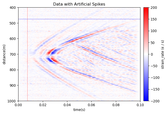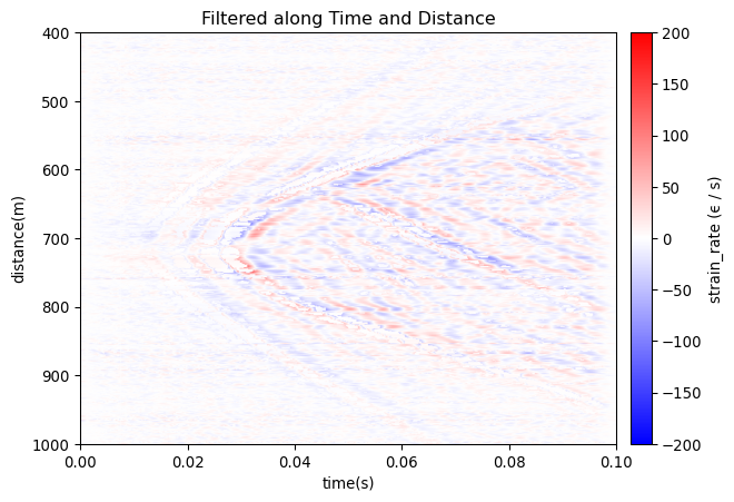 The resulting signal had some of the spikes removed with minimal distortion to the original signal. To remove the time spike, we need to apply the filter along the distance axis. We could apply two filters separately, but often a multidimensional filter is easier.